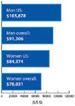 Salary according to gender only. There continues to be a $20,000 gap between men's and women's average salaries. Overall, women reported an annual base salary of $70,031 (women working in the US earned an average of $84,374). Male employees earned $91,306 in compensation overall, and men in the US earned $105,878 on average (see Figure 3).