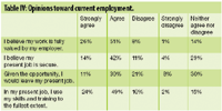 Results are shown in Table IV. Of note is that the percentage of respondents who agreed or strongly agreed that their job was secure is the lowest (55%) since 2000, (see sidebar, "Retrospective" and Table IV).