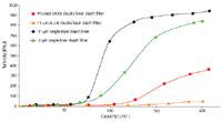 Figure 3 Breakthrough curves for single and double layer depth filter technologies; post bioreactor offload application; 5 mio cells/mL and 75% viability; 11 μm/4 μm filter is from Sartorius-Stedim Biotech.