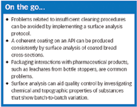 There are a number of ways in which surface analyses have helped to resolve key operational issues in pharmaceutical manufacturing. Herein, both process and product features have been considered using chemical and physical investigative techniques. The ability of advanced surface analysis techniques to identify what species are present, in what quantity, in which location and relative to what topography has enabled previously intractable phenomena to be resolved. The insights gained have added value to the business processes either by accelerating time to market or by affecting the rapid recovery of a costly malfunction.