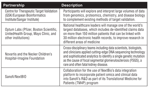 Personalized medicine is rooted in the hypothesis that diseases are heterogeneous in their causes, rates of progression, and their response to drugs. Simply put, each person’s disease is potentially unique, and therefore, that person needs to be treated as an individual. Thus, the shift toward personalized medicine has required that manufacturers develop rigorous strategies to understand the cause or origin of a disease as opposed to simply treating patients’ symptoms. Ted Driscoll, digital health director at Claremont Creek Ventures, believes that mining data on genomics, proteomics, and metabolomics alongside clinical-trial data and real-world clinical data will enable manufacturers to more thoroughly understand the particular structure of a disease. This understanding will lead to faster and more accurate identification and validation of targets and biomarkers for designing personalized therapies (5). Some forward-thinking manufacturers are already participating in public-private research initiatives to harness the power of “big data” and genome sequencing to improve the success rate for discovering new personalized medicines (Table I). Such strategies will enable manufacturers to implement patient-centered approaches across all stages of translational and clinical research in therapeutic areas where targeted therapies are lacking.