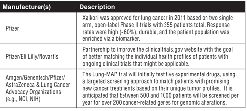 Some global manufacturers have already launched personalized medicine clinical trial strategies that could change how drugs are studied and potentially cut the time and cost of bringing them to market (see Table II). Multi-drug, multi-arm, biomarker-driven clinical trials are one strategy manufacturers are putting into practice. According to Maria Freire, PhD, president and executive director of the Foundation for the National Institutes of Health, this clinical trial design establishes a model of clinical testing that more efficiently meets the needs of both patients and drug developers. “This strategy will validate biomarkers and facilitate drug development in one infrastructure, to more rapidly provide safer and more effective treatments to patients” (6).