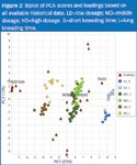 The biplot can help interpret the trends seen. Variables that point in the same direction show a high-positive correlation, whereas variables that are in the opposite direction reveal a high-negative correlation. Variables that are plotted perpendicular (orthogonal) to each other are uncorrelated. The higher the loading, the more the variable contributes to the PC. For instance, a high loading is given to the variable yield on PC1; the loading for yield points out in the direction of the LD samples, which means that LD samples have higher values for yield than HD samples. Therefore, yield is negatively correlated with dose.