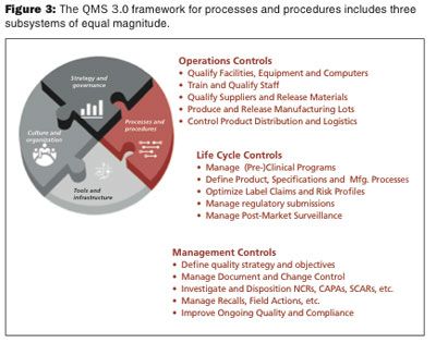 Figure 3). Rather than having six or seven subsystems at various levels of detail, the QMS 3.0 framework has three subsystems of equal magnitude: management controls, lifecycle controls, and operations controls. These subsystems do not introduce any new regulations; rather, they logically restructure regulations that already exist. Not incidentally, this framework is easier to communicate to (and is better understood by) executive management.