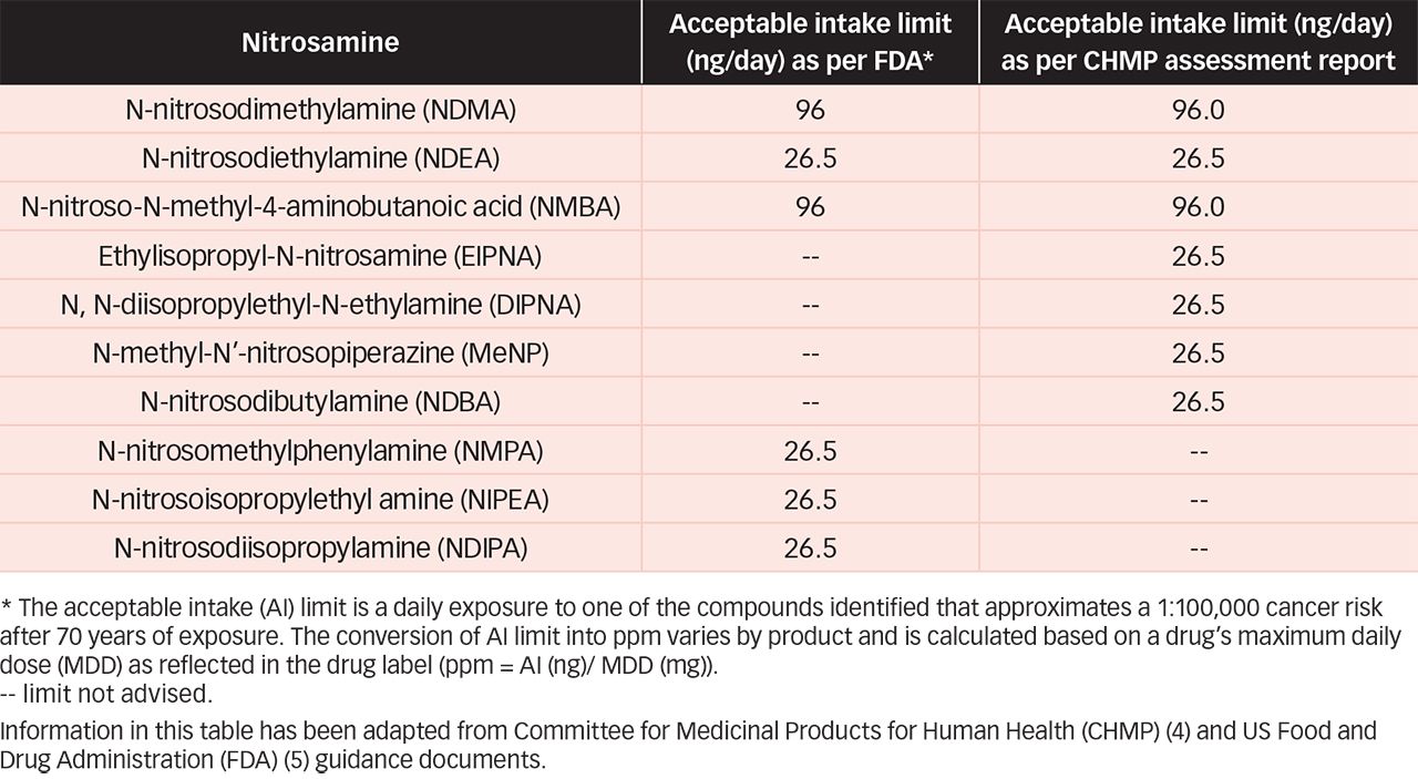 Table I. Acceptable intake limits for some specific nitrosamines in drug products.