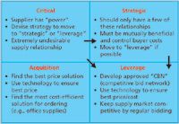 For example, if a company is making a purchase where the supplier maintains the power in the relationship (i.e., the "critical" quadrant), the buyer is paying an absolute premium. Typically, less than 10% of a company's spend will be designated as "critical," according to my experience. Companies with poor purchasing practices, however, often allow suppliers to act as if they were a natural monopoly. A purchaser should review its spending to move supplier relationships from the "critical" quadrant to "strategic" or better yet to "leverage" positions (see Figure 1). My experience suggests that on average, only 20% of spend is truly "strategic," and most of what is purchased can be highly leveraged among multiple suppliers.