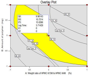 The independent variables were weight ratio of HPMC K15M to HPMC K4M (X1) and amount of polymer (X2). Cumulative percentage drug release after 6 hrs (% Q6), t50- hrs and t75- hours (i.e., time required to release 50% and 75% of the drug respectively) and lag time (hrs) were selected as dependent variables.