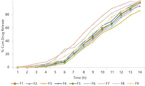 This may be due to structural reorganization of hydrophilic HPMC polymer. Increase in the amount and viscosity of HPMC may result in an increase in the gel strength of the polymer and increased mechanical strength of the coating, reducing medium-permeation rate, and resulting in longer lag time.