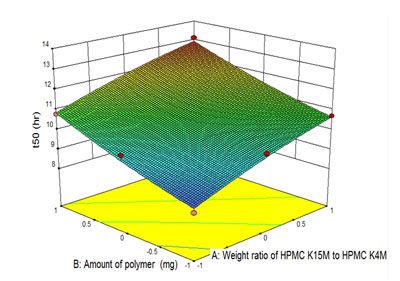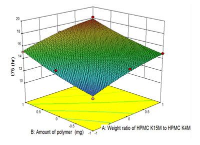 Results of polynomial equations (Equations 3 and 4) and surface plots (Figures 4 and 5), indicated that both the variables X1 and X2 showed significant effect on t50 and t75 (p < 0.05). As the weight ratio of HPMC K15M to HPMC K4M increased, the t50 and t75 values increased:
