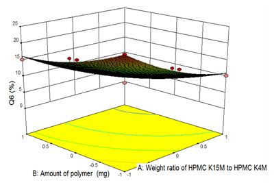 Therefore, % Q6 was considered as one of the dependent variables in this research. The value of % Q6 varied from 2.45 to 24.16 for formulated batches and showed a good correlation coefficient (R2= 0.9148). Results from use of the polynomial equation (Equation 2) and surface plot (Figure 3) indicated that both the variables X1 and X2 showed significant effect on % Q6 (p < 0.05). As the weight ratio of HPMC K15M to HPMC K4M increased, the % Q6 value decreased.