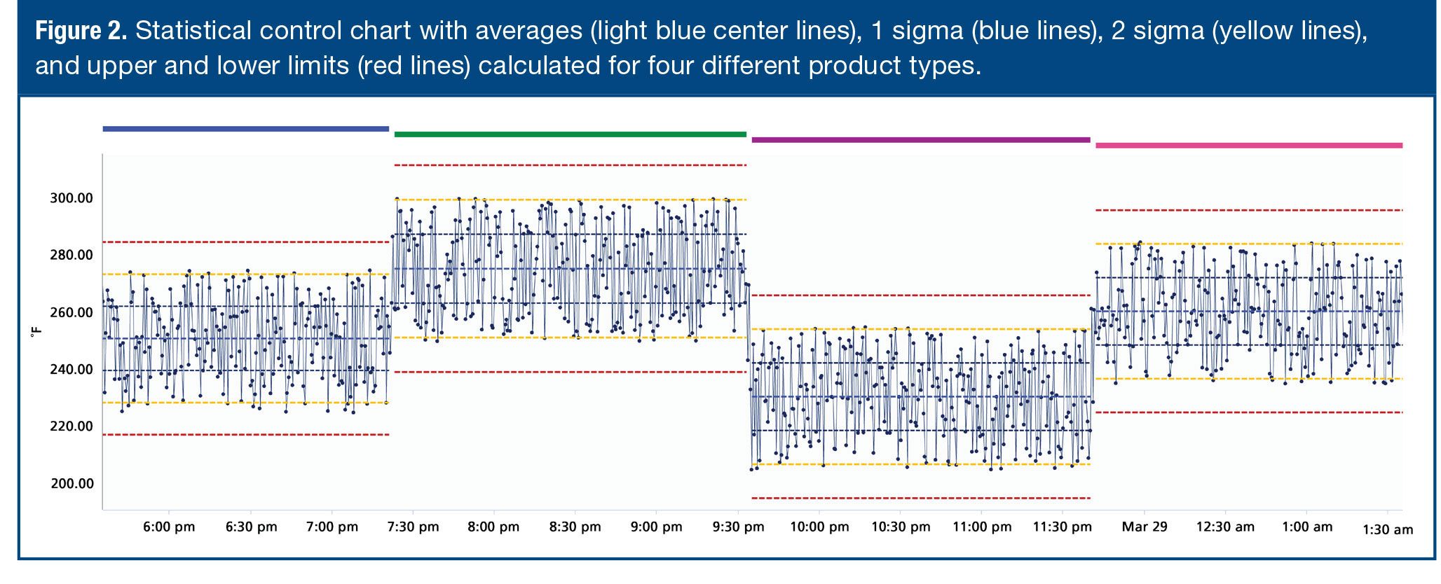 Figure 2. Statistical control chart with averages (light blue center lines), 1 sigma (blue lines), 2 sigma (yellow lines), and upper and lower limits (red lines) calculated for four different product types. Click to enlarge.