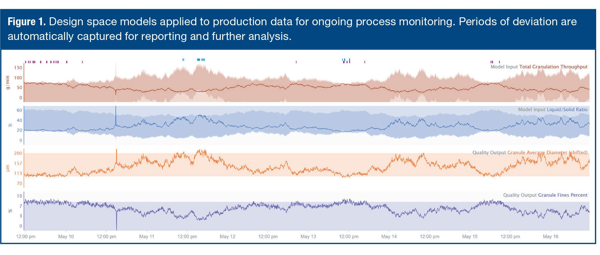 These inputs were used in a multivariate regression model to determine the influence on critical quality attributes. The multivariate QbD model was then deployed in commercial manufacturing to provide a monitoring view of the process, flagging deviations from the defined quality specifications as they occurred to allow quick remediation (see Figure 1).