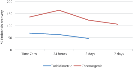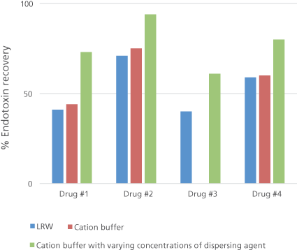 In most cases, a combination of several treatments (e.g., dilution in cation/dispersant buffer over time with heat and vortexing) was required to achieve a successful result. Passing results (>50% recovery of endotoxin) were targeted for seven days after CSE was spiked into each sample. A comparison of CSE recovery for different detection methods is shown in Figure 2. The final product vial was used in each study and samples were stored at 2–8 °C after spiking.