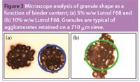 Given that all FMHG processes were in excess of the melt temperature of the binders, consolidation of the agglomerated particles was achieved by fluidizing the granulate using ambient air for 30 s at the end of each granulation run.6 The granules that were produced were sized using standard sieving techniques to determine the effect binder viscosity, concentration, molecular weight and filler type had on the particle size distribution of the powder bed. The viscosity of the binders (PEG and Lutrol) were determined at 100 °C using an AR2000 rotational rheometer (TA Instruments; Crawley, UK) in continuous shear mode. Granule shape, uniformity and dimensions were determined using a Nikon Eclipse ME600 microscope using ×50 magnification and Lucia G software (both Nikon Instruments; Badhoevedorp, The Netherlands).