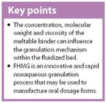 FHMG is an innovative method of preparing pharmaceutical granules of a suitable size and compression profile for subsequent processing into high-performance solid dosage forms. In FHMG, a molten binder, API and other functional excipients are heated together in a fluidized bed system; when the granules are cooled to the solid state (also within the fluidized bed) it is found that the molten binder acts to form solid bridges resulting in a consolidated granule.