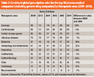 Table II: Combined global prescription sales for the top 50 pharmaceutical companies (excluding generic-drug companies) by therapeutic area (2009â2014).