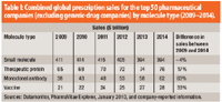 Table I: Combined global prescription sales for the top 50 pharmaceutical companies (excluding generic-drug companies) by molecule type (2009â2014).