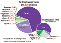 It comes as no surprise that the most common route of administration is oral, accounting for 64% of Rx and 58% of OTC products. Among oral prescription formulations, 85% fall into familiar classes: "tablet; oral," "capsule; oral," "tablet, extended release; oral," "capsule, extended release; oral," "solution; oral," "for suspension; oral," and "syrup; oral." There are, however, another 49 listed oral dosage forms, 17 of them represented by just a single product. The single-product delivery classifications include "film, extended release; buccal" (lidocaine from Noven) and "capsule, tablet, capsule, delayed rel pellets; oral" (for TAP's "Prev-pac," a combination of amoxicillin, clarithromycin, and lansoprazole). Overall, FDA recognizes 200 dosage forms (see Figure 1).