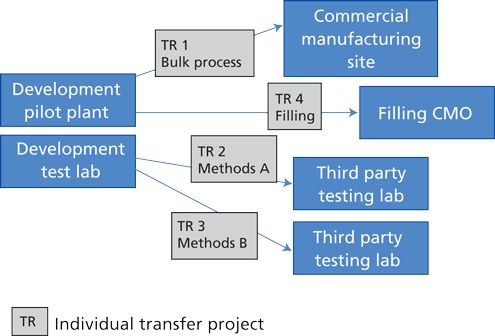 Technology transfer typically includes a change in location, ranging from a move between different facilities on the same campus or between locations on different continents; it often includes a manufacturing scale-up. In an environment with specialized contract manufacturing organizations (CMOs) and contract testing laboratories (CTLs) and the need to control capital investment and minimize time to market, the start-up of commercial manufacturing often requires more than a single technology transfer between two sites. More likely, multiple transfers need to be coordinated to meet start-up timelines, launch dates, and manufacturing capacity expectations.