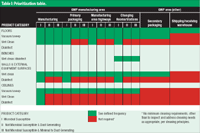 A team of industry microbiology subject matter experts worked to categorize cleaning options and developed the prioritization schematic shown in Table I. The table is used by manufacturing and quality heads to first identify the applicable GMP area (e.g., manufacturing, packaging); the applicable product category (e.g., microbial susceptible and/or dust generating); and the minimum requirements regarding what to clean (e.g., floors, benches) and how to clean (e.g., vacuum, sweep, disinfect).