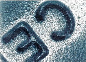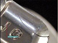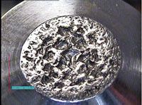 Incompatability of geometry between the punch-head profile and tablet-press cams will lead to premature head wear. The punch heads are subjected to high cyclic loadings, typically 20 kN to 50 kN, many thousands of times per hour of running. If the punches are running tight for any reason, there will be resistance between the punch heads and the cams and rollers, creating high frictional force. This will lead to premature wearing of the heads and eventual fatigue and total breakdown of the metal (see Figure 5). An additional effect of this breakdown will be contamination in the tablet press by the metal particles, leading to expensive damage to tooling, press cams, and compression rollers. This type of damage can be avoided by close monitoring of the tooling condition and good tooling and tablet-press maintenance procedures.