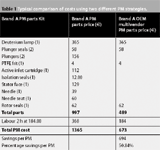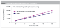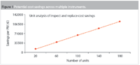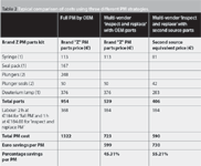 A cost comparison of the various options is illustrated in Table 1, which lists the typical parts included in an OEM's high performance liquid chromatography (HPLC) PM kit (illustrated as Brand "A") and their individual costs that add up to a total PM kit cost of approximately €1005. As this example shows, an OEM multivendor direct service provider using the 'inspect and replace' methodology can offer significant cost savings to a laboratory, with little increase in risk. Savings of 50.84% per PM are achieved by reducing both parts and labour. Figure 1 illustrates the potential cost savings across multiple instruments.