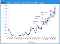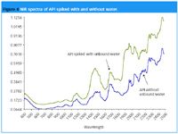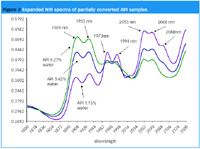 Differentiation of bound versus surface water/ethanol by NIR. In the NIR region, water has strong absorption bands with peak maxima of ~1440 (overtone) and 1930 nm (combination band). Similarly, because of its hydroxyl functional group, ethanol also has strong absorption bands at 2082 and 2309 nm. Figure 1 shows the spectra of three representative API samples that achieved different degrees of ethanolate–hydrate conversion. The water content of these samples was determined to be 1.15% (spectrum in blue), 3.42% (green) and 6.27% (red).