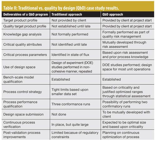 Table II contrasts the two different approaches and demonstrates the advantages of the QbD approach to development. The deliverables associated with the product lifecycle are more robust and timely. Additionally, the long-term support through the CPV program is optimal and flexible. As shown in Figure 1, the advantages can also represent a more robust timeline.