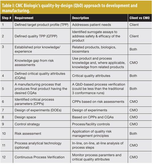 CMC Biologics has developed a QbD development program that serves as the infrastructure of a QbD approach to the development and manufacturing of biologics. Table I identifies the different steps and responsible entities. Discussion with the client using this program tool at the beginning of a project helps establish the strong relationship needed to successfully develop a product and process using QbD principles. A good understanding of target product profiles (TPP) and quality TPP (QTPP) by the client helps immensely with design of a suitable formulation and development of analytical assays to support the product development. Though the steps in Table I are listed loosely in