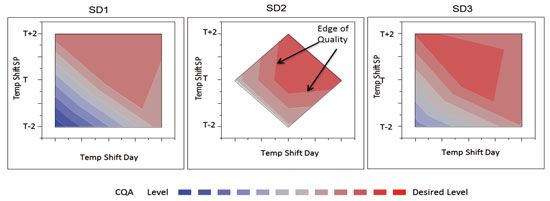 The following example shows an experiment designed to measure impact of seed density (SD), temperature shift degree, and day of temperature shift on an important CQA of a complex biologic. An on-face central composite design was employed in this experiment. The results are shown in Figure 5 along with a visual representation of the design space.