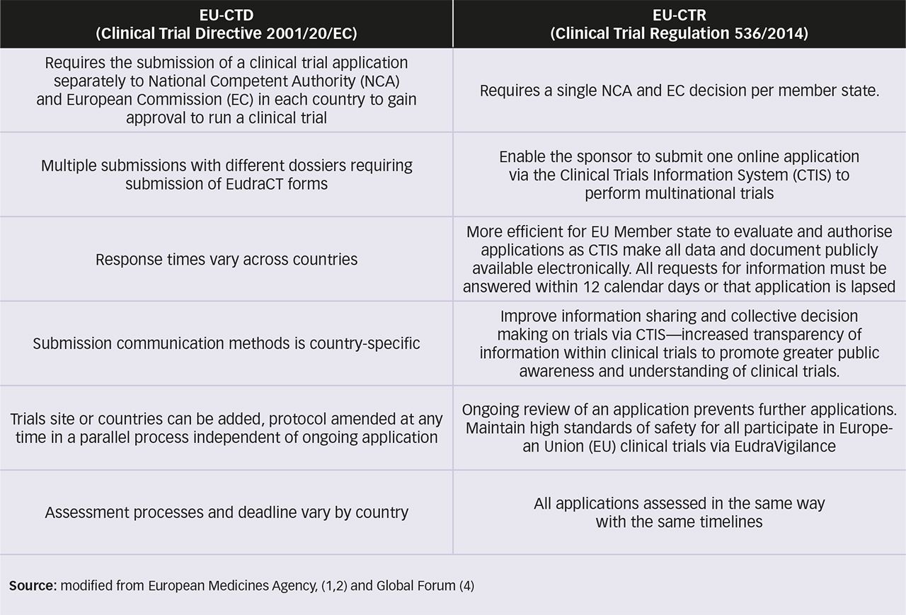 On 31 Jan. 2022, the European Union (EU) initiated the three-year transition for member states to submit clinical trials under a new legal framework Clinical Trial Regulation 536/2014 (EU‑CTR) which replaces Clinical Trial Directive 2001/20/EC (EU-CTD) while increasing transparency and harmonizes the submission, assessment, and supervision processes for clinical trials in the EU (1,2). Between now and 31 Jan. 2023, sponsors can submit clinical trials under EU-CTD or EU-CTR; thereafter, all trial applications will be subject to EU-CTR (3).
