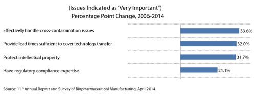 CMOs are being increasingly asked to quickly resolve tough problems, including cross-contamination issues. When BioPlan evaluated the changes over the years in how important clients/sponsors have considered various factors when selecting a CMO, we found a sizable increase in the share of respondents indicating that it’s “very important” that CMOs “effectively handle cross-contamination issues.” That consideration rose from 26.4% of respondents in 2006 to 60% this year, with that 33.6% point change the largest of any factor (see