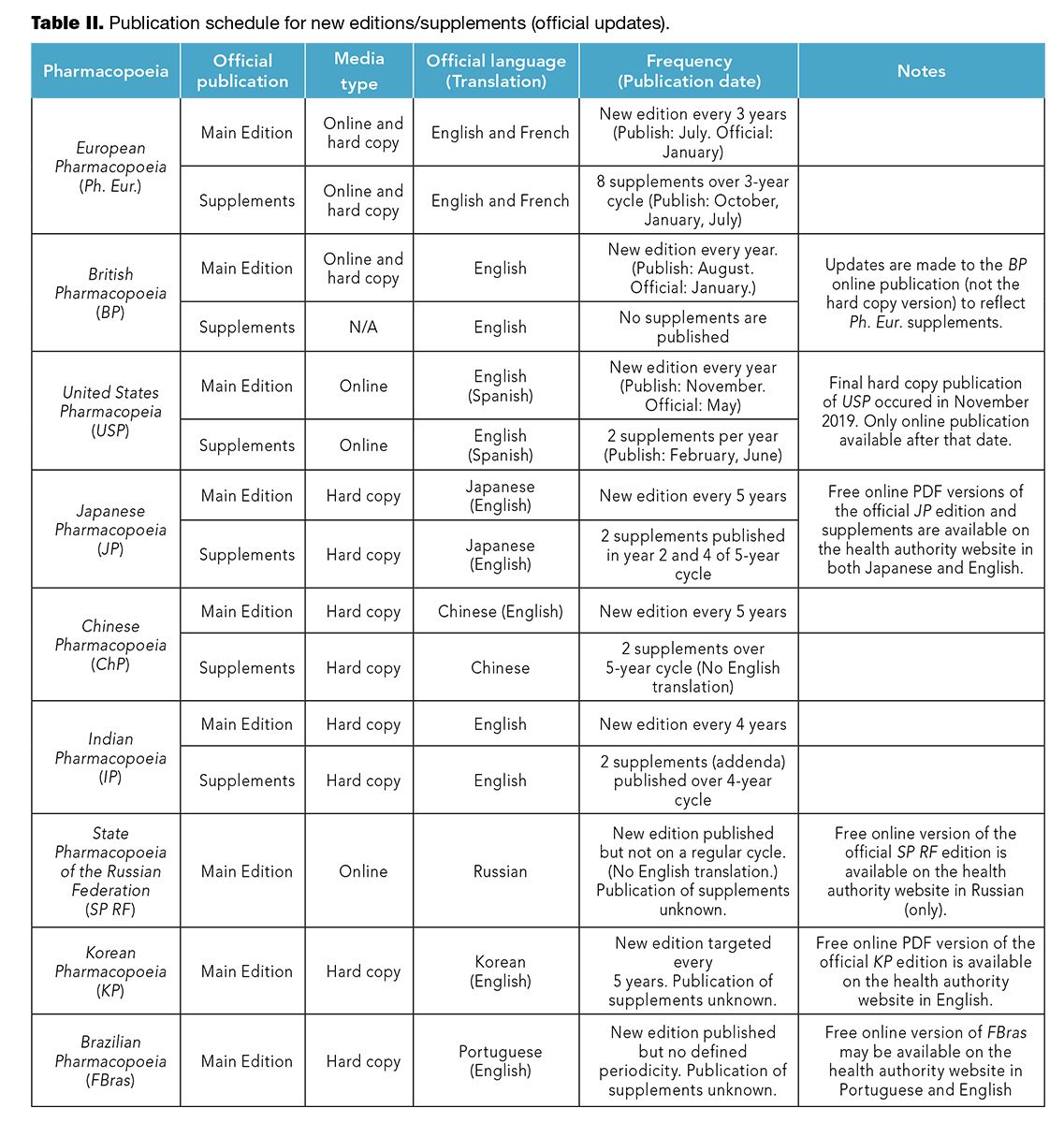 Shifting focus from the global to the national pharmacopoeias, special consideration should be given to JP, because it does not fit as easily into the global or national designations. Because it is primarily required in Japan only, the JP is a national pharmacopoeia according to the authors’ definitions. The revision process and regular publication schedule for JP, however, more closely align with those of the global pharmacopoeias, making it simpler for a company to include JP in their surveillance activities. As with the global pharmacopoeias, the JP revision process includes steps that are internal to the organization and steps that connect with external stakeholders, with communication of proposed and official updates occurring on a regular basis. Table I shows that proposed updates are published four times per year in the JP forum on an established schedule. The JP forum is published in a hard copy/print version only, although some of the proposed revisions are also posted on the JP website for review and comment. The JP forum is provided in both the Japanese and English languages within the same print copy, but the entire content is not exactly the same in each publication due to delays in translation of some of the proposals. This translation timing may make it difficult for a company to provide a timely response to revisions published in the JP forum. Table II reveals that official JP updates are published in a new edition every five years, with two supplements published during the five-year cycle between editions. Partial revision to official JP requirements may also be made at any time on the JP website, if necessary.