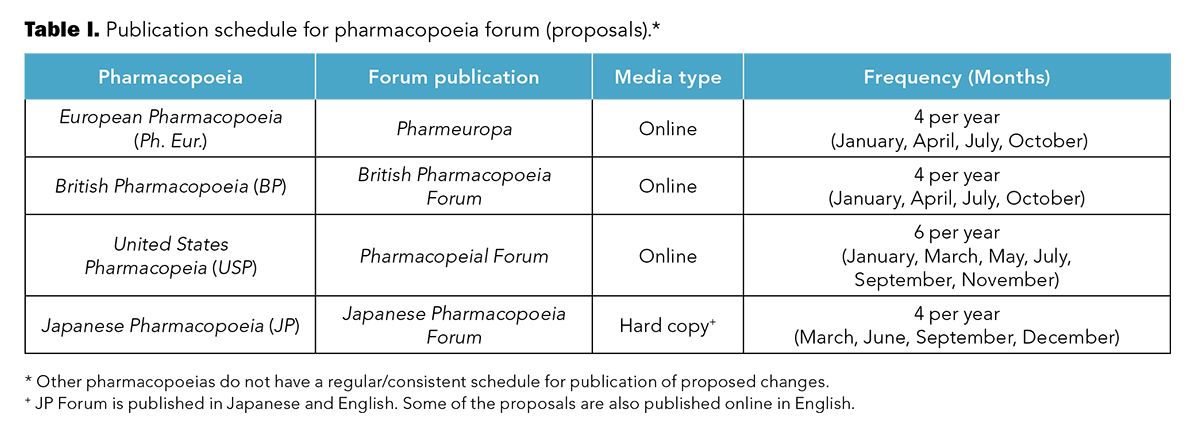 Proposed updates in pharmacopoeia forums. The forum publications for global pharmacopoeias, typically available on-line and in English only, contain proposals for new and revised monographs and general chapters that are provided for public review and comment. The forum publications for Ph. Eur., BP, and USP occur at a set frequency: four times per year for Ph. Eur. and BP and six times per year for USP (Table I). Having visibility to the publication schedule is beneficial to industry for planning the workload and resources needed for the review process. The expectation is the same for each of the pharmacopoeias to their stakeholders: to review those proposals with potential impact and provide any comments, along with scientific rationale and supporting data regarding issues and concerns with the proposal. Comments are typically expected within 90 days from the date the forum is published.