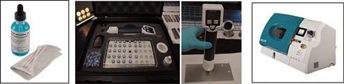 Figure 1: (Left to right) Copper sulfate test kit, electrical pen kit, electrical pen handheld device, and an automated salt spray cabinet. Figure is courtesy of the authors.