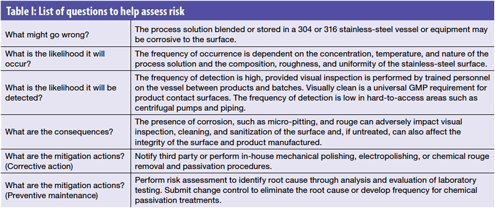 When assessing the risk of the corrosion or rouge to the quality of the next product or batch, one should ask the questions about risk and mitigation actions summarized in Table I.