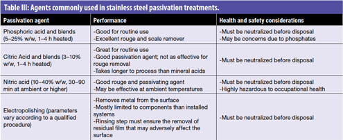 Table III. Agents commonly used in stainless steel passivation treatments. Click to enlarge.