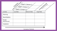Table IV is recommended as a starting point for a commercial, networked Off The Shelf (OTS) system with user specific configurations (i.e., network configurations). Such an automated system would fall into category four, as defined by GAMP (1). This table can be extended to a third dimension to include systems or software that have been developed for a specific user (GAMP category five) and to include systems that do not require any user specific configurations (GAMP category three). GAMP categories indicate the level of system customization. The extent of validation is lower for GAMP category three and higher for systems in GAMP category five.