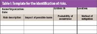 The project manager collects input on potential hazards including possible harm. For consistent and complete documentation, forms should be used. The forms should have entry fields to include relevant data on the individual who made the entry, risk description, possible hazards and harms, probability of occurrence, and possible methods of mitigation. An example is shown in Table I.