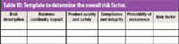 Information from this category will be used to calculate an overall risk factor. In our example, the risk categories are converted into numeric values such that: high = 3, medium = 2, and low = 1 (See Table III).