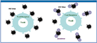 Figure 2: Schematic mechanism of a dendrimer as a topical vaginal microbicide. HIV viral particles (black) attach to T-cell receptors on the surface of the T-cells (blue) as an initial step in infection (left, without dendrimer gel application). Dendrimers bind to the surface of the HIV particles and block attachment, reducing or preventing infection (right, with dendrimer gel application). (FIGURE 2 IS COURTESY OF THE AUTHORS.)