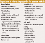 Solid-state characterization of API. The API's solid-state properties can be categorized as molecular, particle, or bulk (see sidebar, "Importance of solid-state properties for pharmaceuticals"). The molecular level encompasses properties such as crystalline forms, hydrates, solvates, and amorphous forms. Differences among the intermolecular arrangements and free energy distinguish these forms in solubility, manufacturability, bioavailability, and stability (5). These factors are critical when characterizing the RLD's API solid form during the development of generic products.