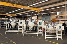 The tumble blenders provide gentle agitation and are used for dry applications such as powders and pellets. They are suitable blenders for batches requiring the dispersion of extremely small minor components and low shear intensity. The 1-, 5-, and 7.5- ft³ blenders are equipped with type four finger protection light curtains; V-cone vessel for internal pressure up to 5 psi (argon purge), and vacuum operation up to 29-in. Hg.; 50-psig heating/cooling jacket; explosion-proof brake motor; and NEMA 4 control panel with Type X purge system, appropriate for Class 1 Division 1 hazardous locations.