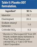 A direct-compression ODT formulation usually contains diluent, disintegrant, lubricant, flow aid, flavor, sweetener, and often color. A review of currently marketed ODT product labels shows that mannitol is a commonly used diluent or bulk excipient. Directly compressible mannitol grades exhibit an appropriate balance of sweetness, mouth feel, solubility, and rapid dispersibility because of wicking (5). As a result, mannitol has gained in popularity for ODTs over other diluents typically used in direct compression such as lactose.