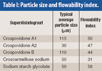 Flowability. Flowability index results are shown in Table I. Sodium starch glycolate provides the best flow as a result of its spherical particle morphology and narrow particle size distribution.