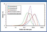 Particle size and distribution. A comparison of particle sizes of various disintegrants is shown in Table I and Figure 1. Sodium starch glycolate and croscarmellose sodium show similar average particle sizes; however, sodium starch glycolate has a narrower distribution, which contributes to the good flow properties. The particle size differences between the various types of crospovidones are shown. Because crospovidone A2 offers the smallest average particle size (~30 μm), it is often preferred because small particles result in a smoother mouth feel.