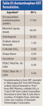 To mask the taste of the active, an encapsulated acetaminophen (88% active acetaminophen) was selected. The active level in the tablet formulation is representative of currently marketed ODT products. To prepare this formula with acetaminophen, the level of mannitol was reduced compared with that used in the placebo while all other ingredients were held constant. The formulation was dry blended and then compacted under three different compaction forces as in the placebo study.