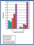 The tablets were evaluated for breaking force and friability. At the highest compaction force (26.7 kN), capping was observed with tablets containing sodium starch glycolate (see Figure 4). Note that at the lowest compaction force, all of the tablets were extremely friable (>5%), so these results were included in Figure 5. Subsequently, the disintegration time for each tablet was evaluated (see Figure 6).