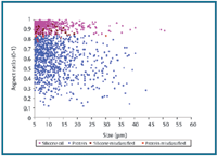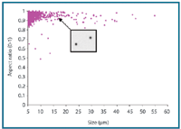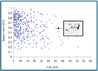 Differentiating silicone oil and protein particles. The mixed siliconeoil droplet and aggregated protein sample was measured using MFI. Visual analysis of the captured images showed that the two particle types could easily be resolved for particles ≥5 μm ECD. Because silicone-oil droplets have a consistently higher aspect ratio compared with aggregated protein particles of the same size (see Figure 5), a simple software filter with an aspect ratio ≥0.85 and ECD ≥5 μm cutoff was applied to the mixed population. The images obtained in the two individual populations prior to mixing were visually examined to assess the accuracy of this filter. This comparison showed an accuracy of 96% for pure samples (i.e., 4% of the particles were incorrectly labeled as either silicone oil or protein aggregates).