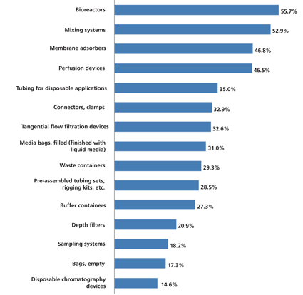 The past 12-year increases in the adoption of different types of SUS as reported by surveyed bioprocessing professionals, in terms of first use at facilities, are shown in Figure 2. There have been approximately 50% increases in first use/adoption of major, big-ticket, SUS equipment, including bioreactors, mixing systems, membrane adsorbers, and perfusion devices.